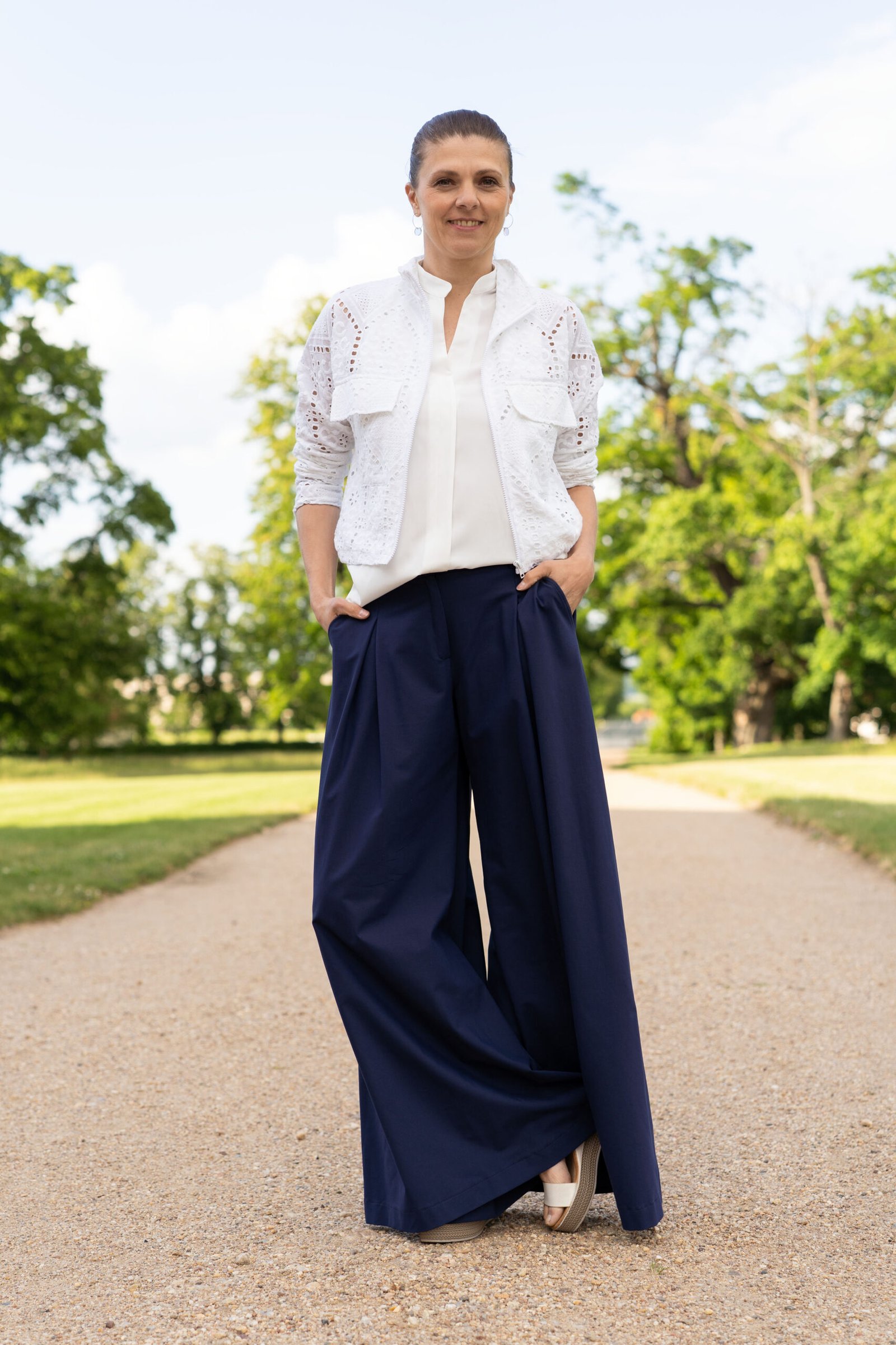 Stylová bundička z bílé madeiry, která spojuje romantický vzhled s ležérním sportovním střihem.
