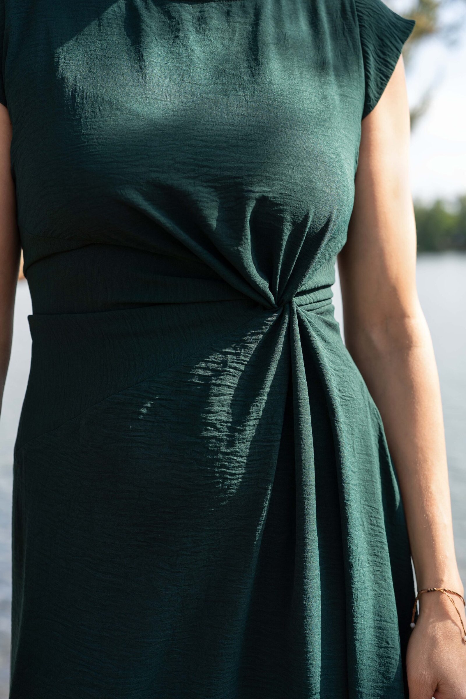 Šaty mají lodičkový výstřih a krátké rukávy, které lichotí postavě a umožňují volnost pohybu. V oblasti pod prsy je dekorativní uzel, který vytváří jemné řasení a opticky prodlužuje siluetu. Sukně ve tvaru A splývá přirozeně kolem těla. V pase je všitá úzká vázačka v bočních švech – umožní vám šaty jednoduše přizpůsobit, ať už chcete volnější nebo více projmutý tvar.
