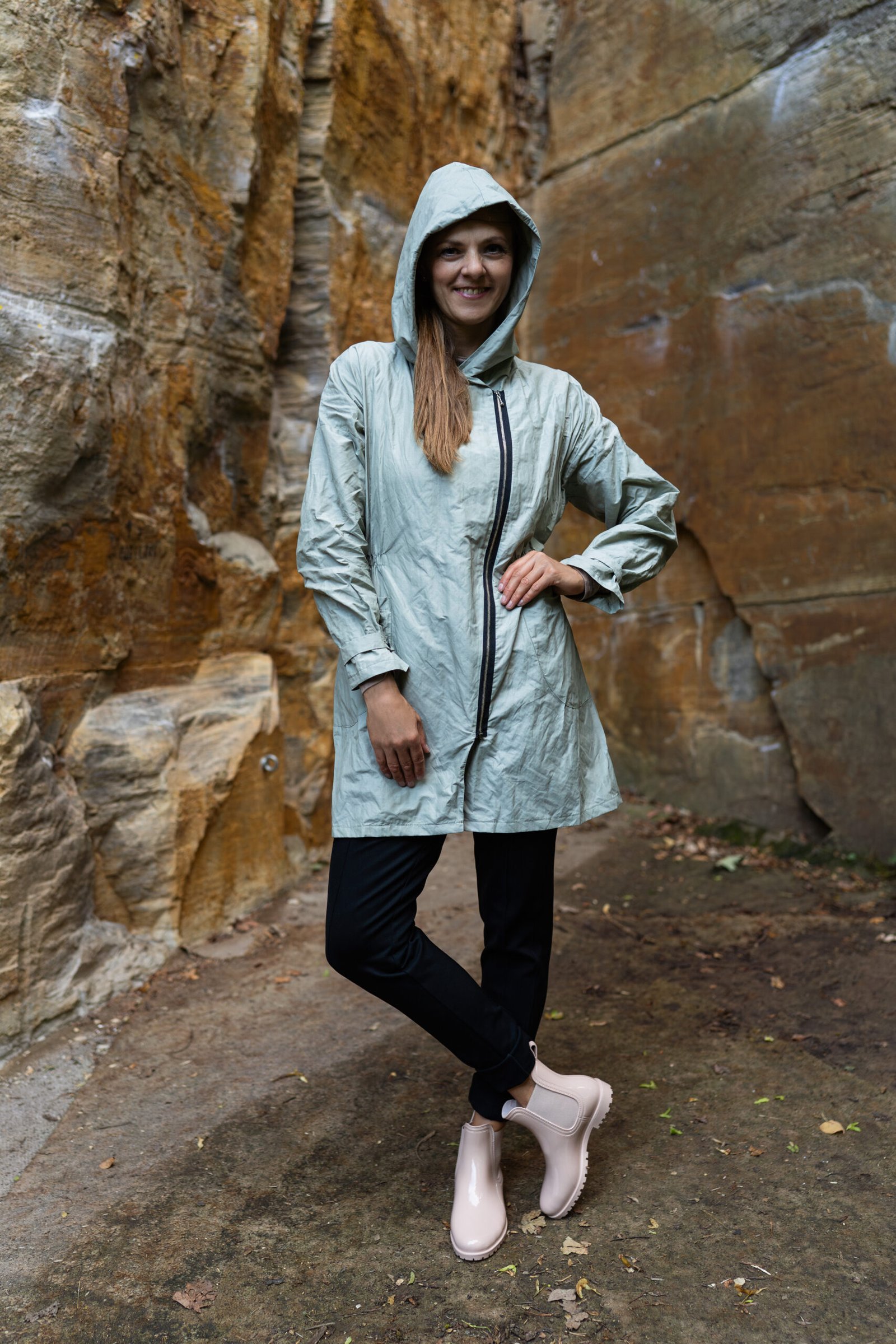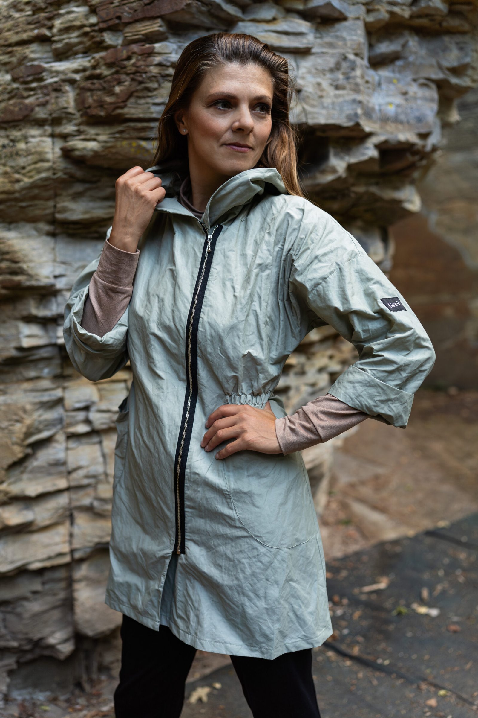 Na vnitřní straně má jemný chloupek, který je hřejivý a příjemný na dotek. Materiál je koženkového vzhledu. Šikmo našitý zip, nakládané kapsy a zřasený pas gumičkou z ní dělají parku originálního vzhledu. Ať už si nasadíte kapuci, rukávy stáhnete ozdobným páskem nebo je jen ohrnete, budete se v ní cítit pohodlně a žensky. Obléknout ji můžete jak k sukni, tak ke kalhotám.
