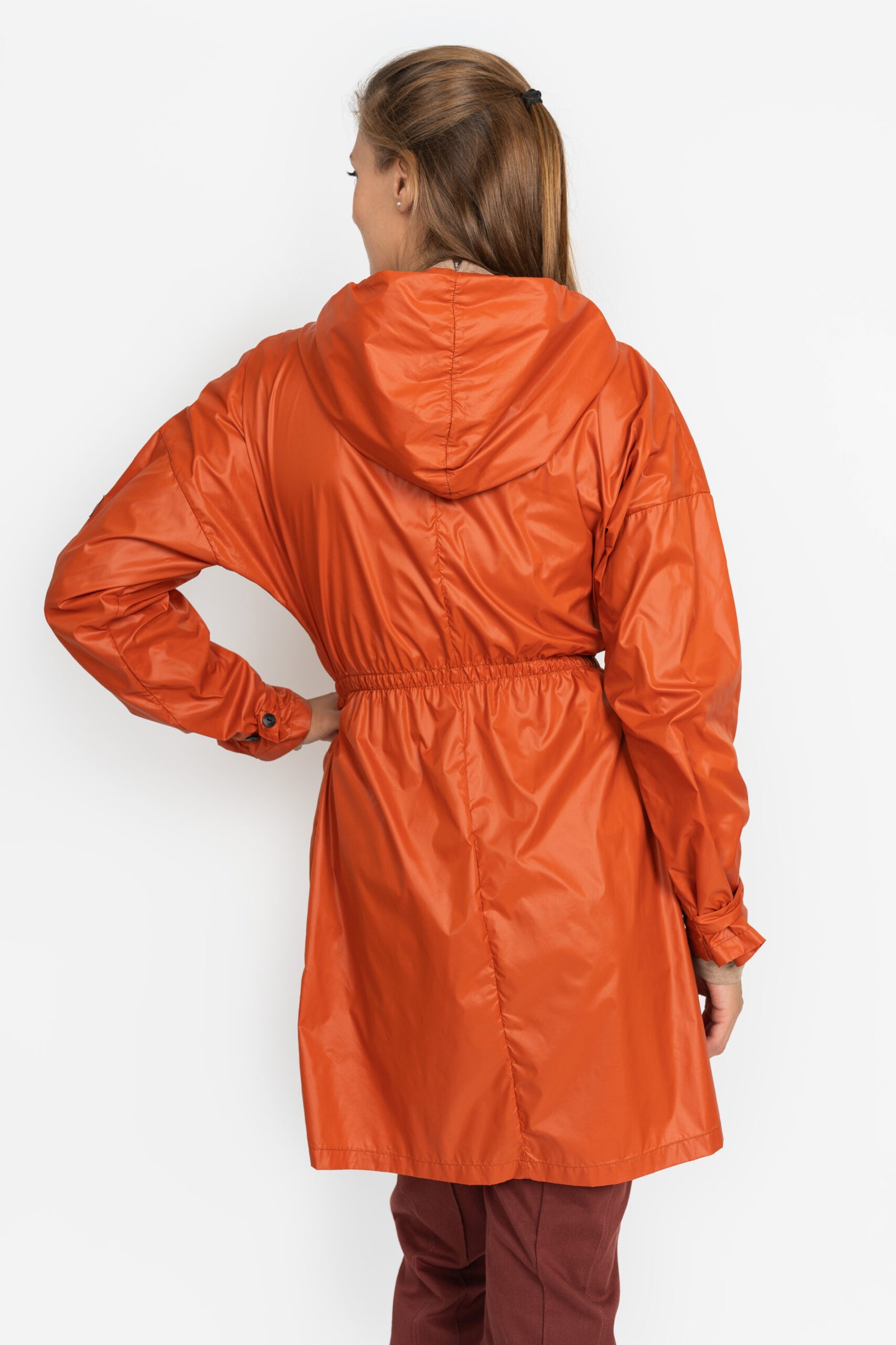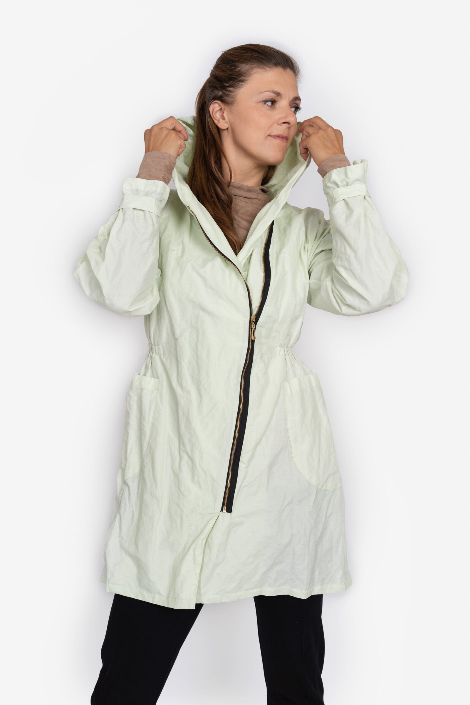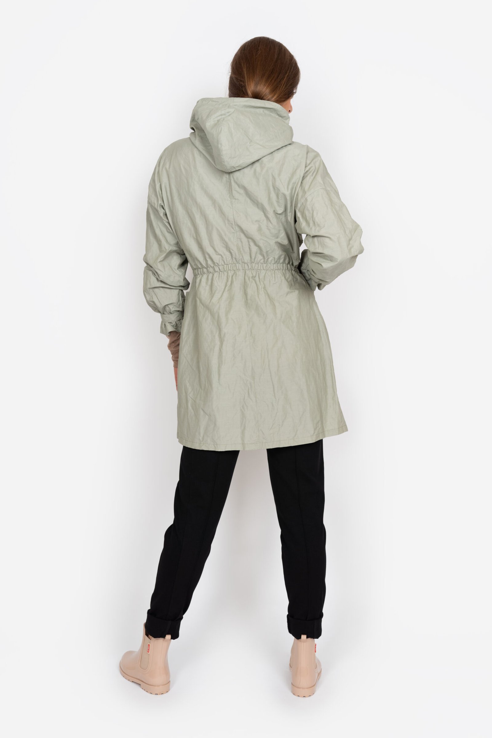 Ať už si nasadíte kapuci, rukávy stáhnete ozdobným páskem nebo rukáv jen ohrnete, budete se v ní cítit pohodlně. Má šikmo našitý zip, prostorné nakládané kapsy a pas stažený pružným prošitím. Parku řadíme mezi neotřelé a funkční kousky oblečení. Lehce se vejde do kabelky a nejen v případě deště ji můžete obléknout k sukni či kalhotám a stále se budete cítit žensky.