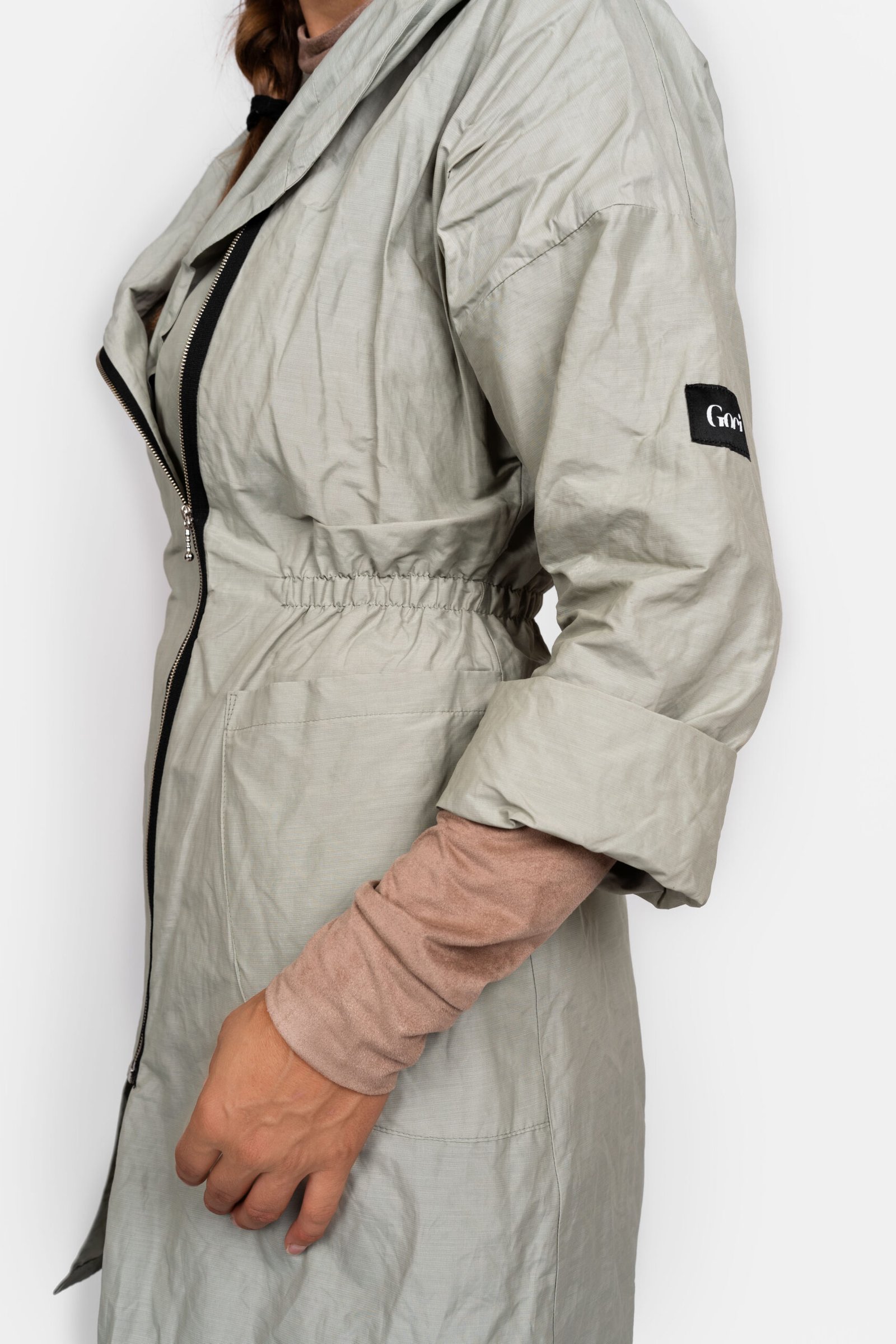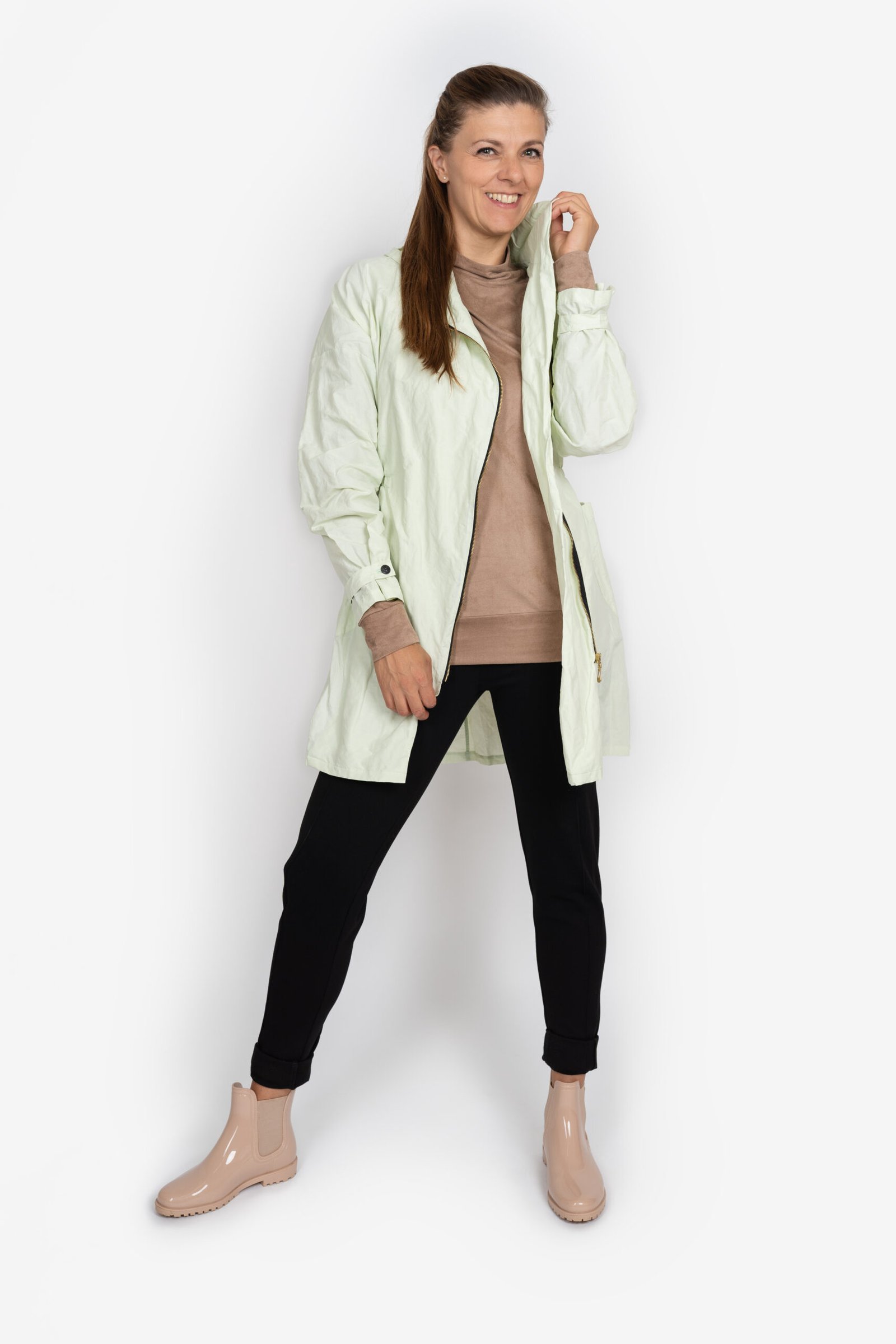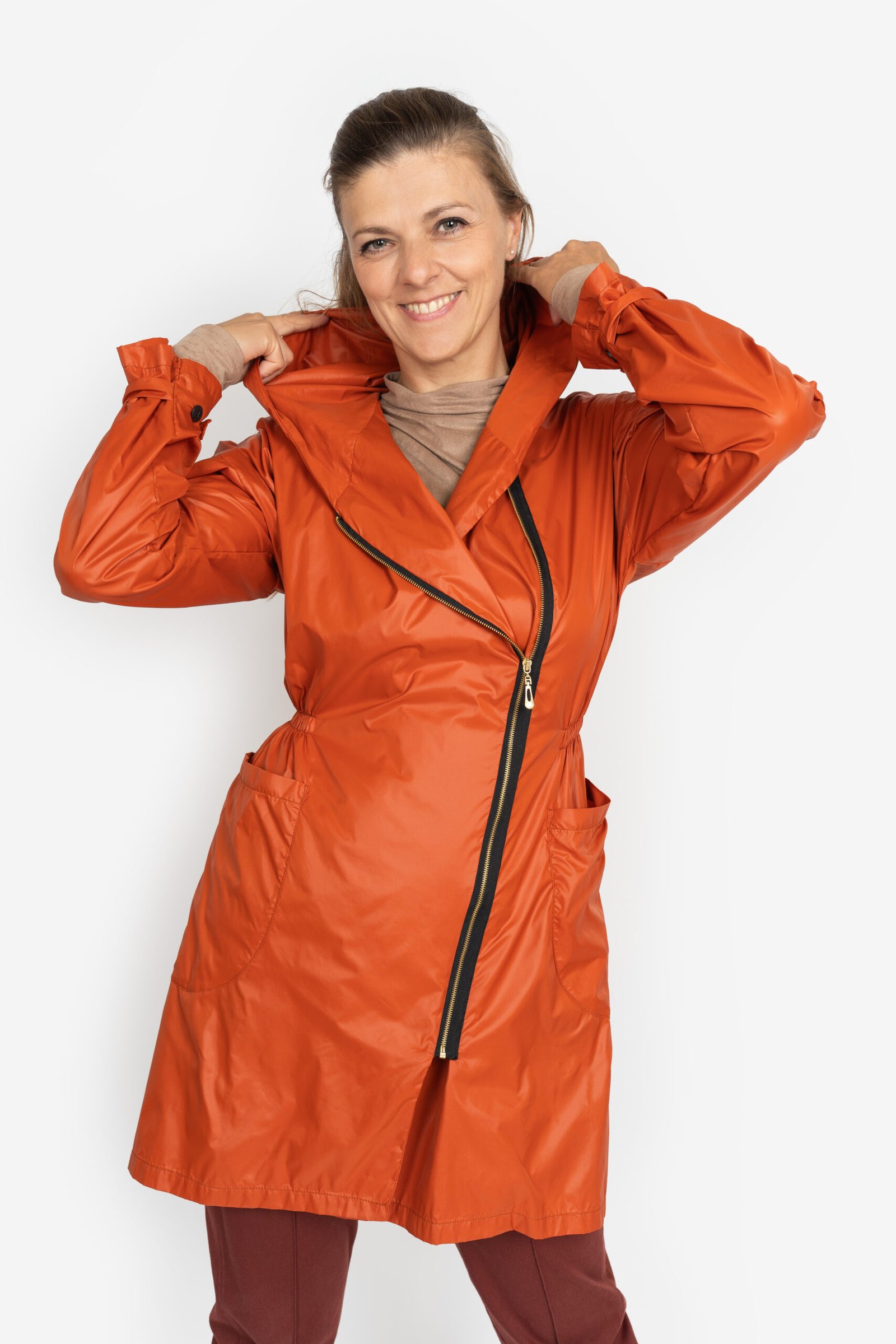 Ať už si nasadíte kapuci, rukávy stáhnete ozdobným páskem nebo rukáv jen ohrnete, budete se v ní cítit pohodlně. Má šikmo našitý zip, prostorné nakládané kapsy a pas stažený pružným prošitím. Parku řadíme mezi neotřelé a funkční kousky oblečení. Lehce se vejde do kabelky a nejen v případě deště ji můžete obléknout k sukni či kalhotám a stále se budete cítit žensky.
